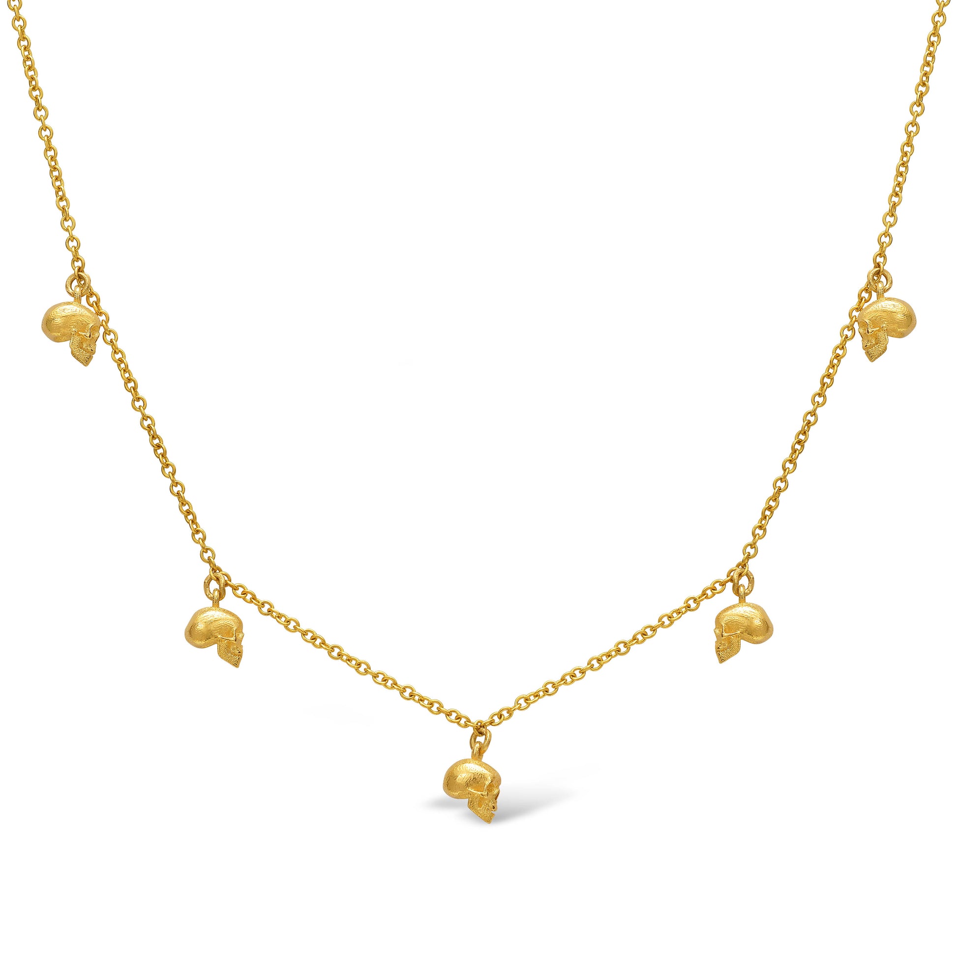 This necklace features five finely sculpted anatomical skulls, each cast in solid 18k gold with a soft, matte finish. Delicate in scale yet unmistakable in presence, it’s a quiet nod to the beauty in impermanence, and to those who don’t shy away from it.